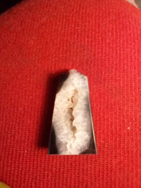 A finely carved specimen in the shape of an obelisk. Small quartz crystals line the centre of the mineral. A decent buy!